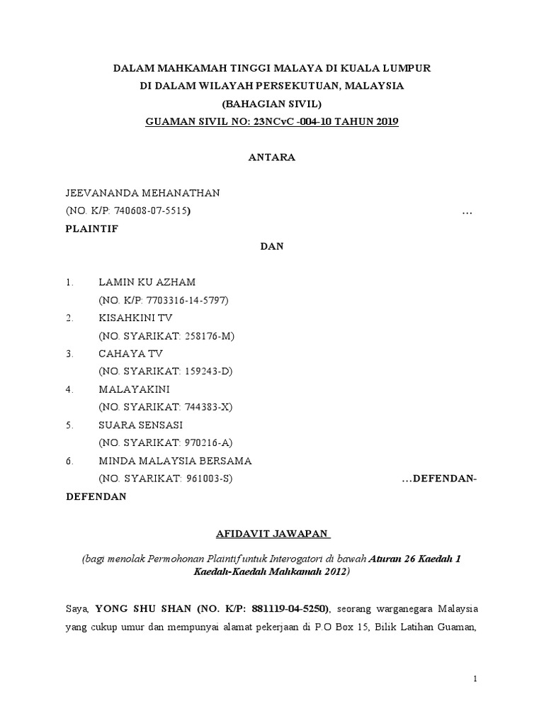 Afidavit Jawapan Defendan Latest Pdf