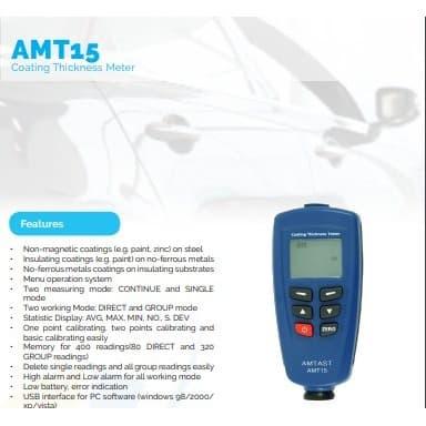 Alat ini digunakan untuk mengukur ketebalan lapisan non magnetik pada besi baja atau alumunium seperti cat enamel plastik. Ini adalah seri terbaru dari Alat Pengukur Ketebalan Lapisan seri AMT-15 Perbedaan dari pendahulunya seri AMT-15A ini cuma pada range dan warna alat ini saja pada alat ini lebih lebar rangenya yaitu 0-1300um dan warna pendahulunya yaitu biru namun yang sekarang lebih elegan dan higienis. Pengukur Integral yang ideal untuk operasi menyerahkan tunggal sebagai tapak lebar yang lebih be.